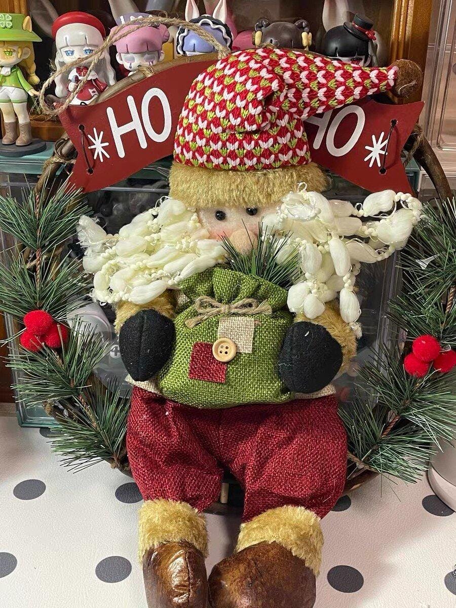 Featuring a cheerful Santa figurine sitting in a round grapevine wreath, decorated with green pine needles, red berries, and a festive “Ho Ho Ho” banner, this piece perfectly captures the warmth of the holiday season.