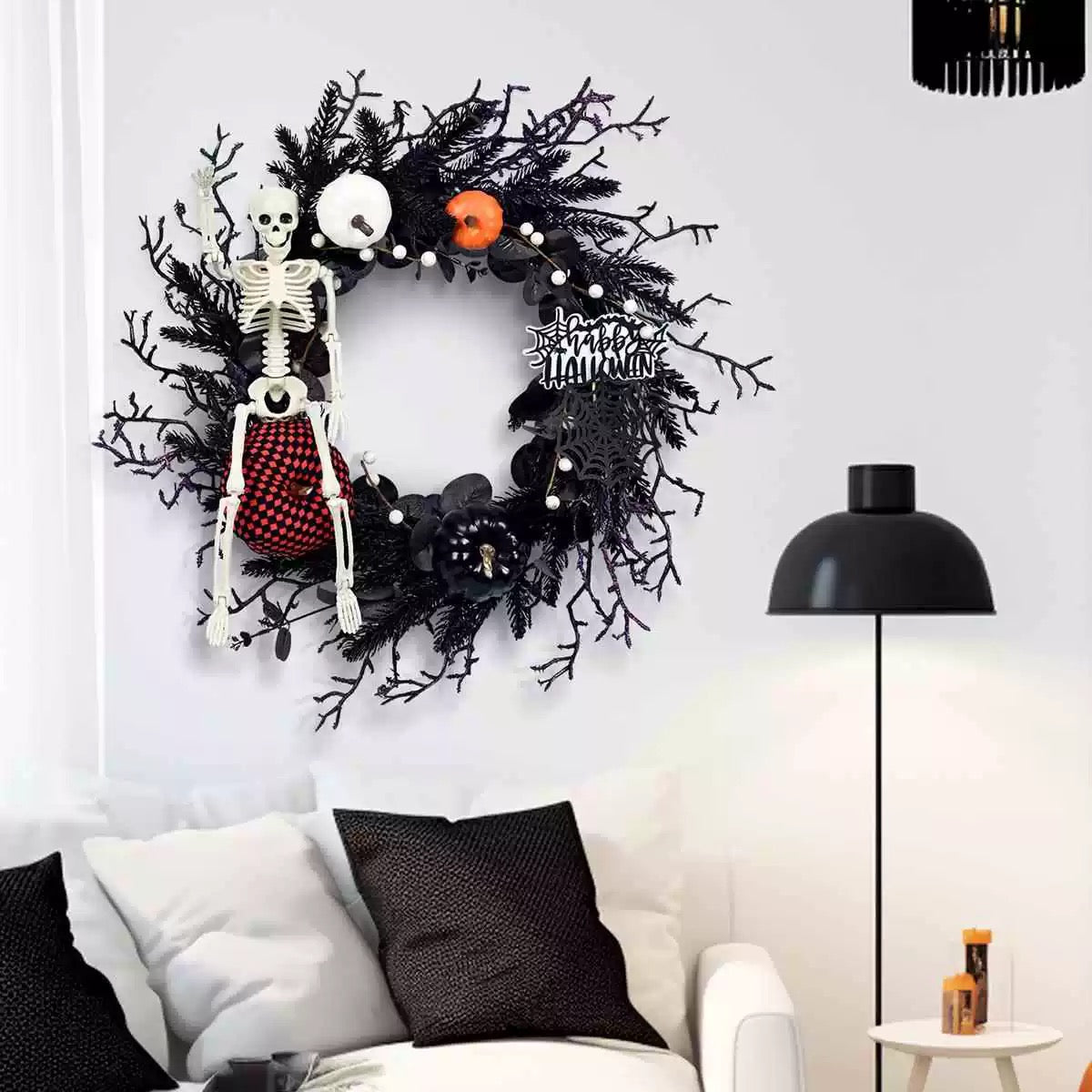 Create a spooky yet stylish vibe in your home with this Black Skeleton Halloween Wreath.